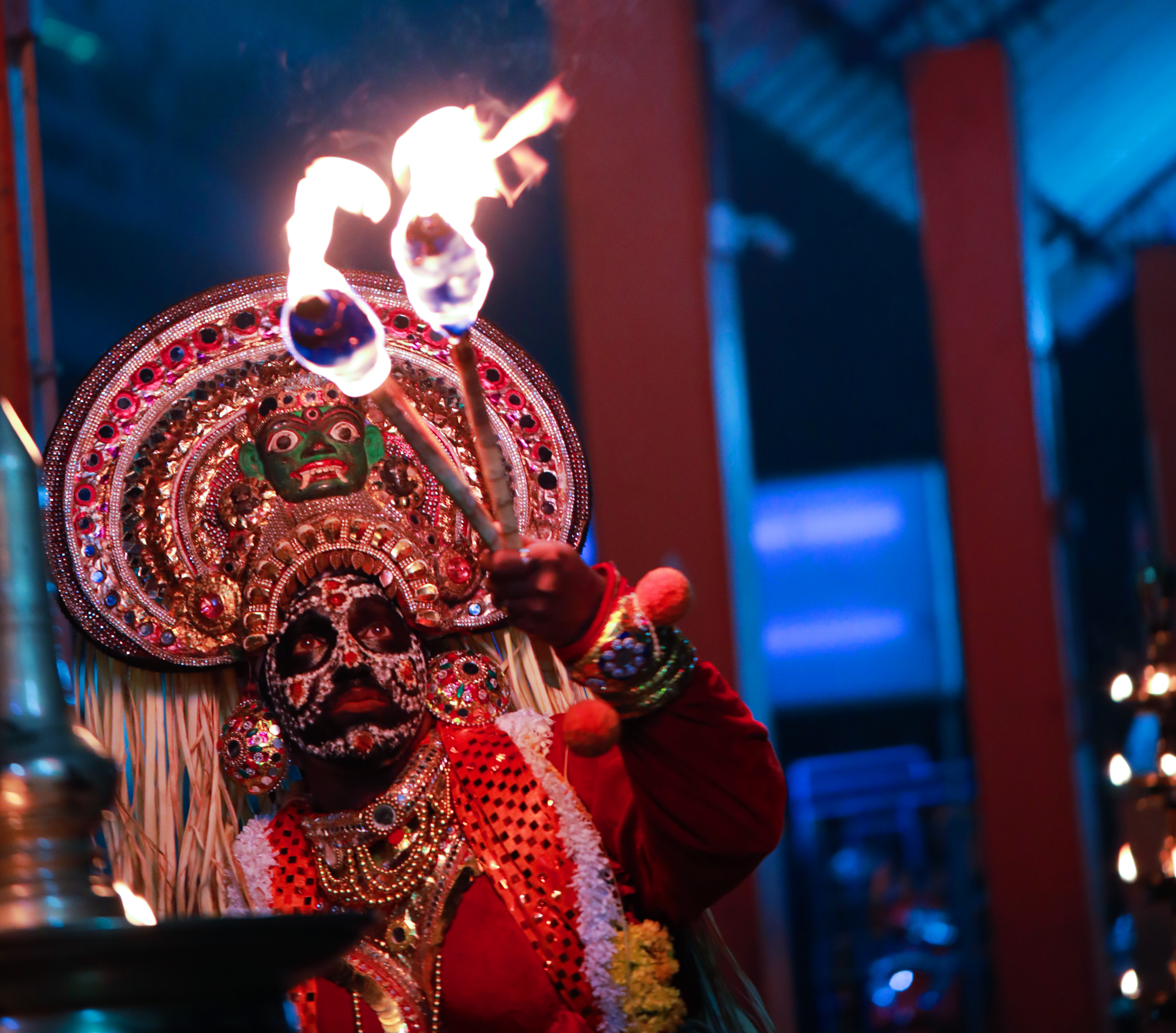 Kali Theeyatu mainly narrates the story of the duel between Darikan, the demon and Goddess Bhadrakali ending with the death of the demon (Darikavadham). The performer, after he wears the headgear, represents the goddess, and exudes a spiritual aura. The play progresses as the 'goddess' narrates the incidents to her father, Lord Siva, who is represented here by the lighted lamp. The performance develops through several chants, dances of thandava style, gestures and gesticulations. The act is concluded with the enacting of the killing of Darikasura, representing the destruction of evil.